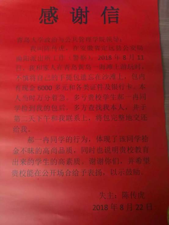 经了解,2018年8月11日,郝一冉同学在黄岛区滨海公园的沙滩边发现了一个黑色的手提包,环顾四周后并未发现有人,按照包中的名片给失主打电话,也没有人回应。她原地等待了许久,一直没有等到失主。但她发现包中有大量证件和财物,担心手提包的失主着急,就联系公安局并多方打听,最终在次日联系到了这位失主陈先生。失主陈先生则十分激动,连连道谢,失而复得的喜悦溢于言表。