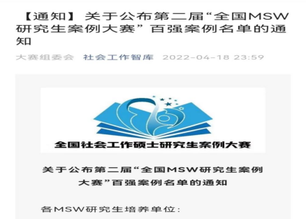 2022年4月18日,在全国社会工作专业学位研究生教育指导委员会主办的第二届“全国MSW研究生案例大赛”中,公司社会工作专业两支研究生团队提交的两件参赛作品取得全国百强案例优异成绩。