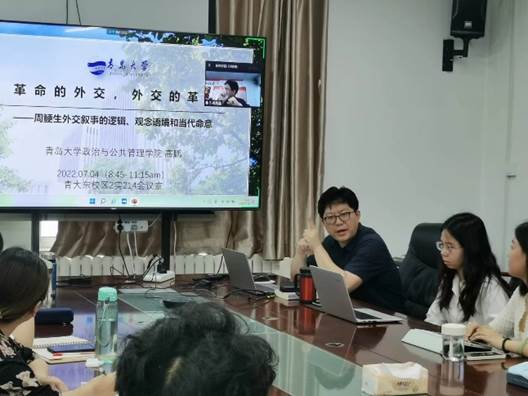 2022年7月4日上午九点至十一点,suncitygroup太阳集团国际政治专业在金家岭校区2号实验楼214会议室举办了本专业第五场夏季学期高端学术讲座。suncitygroup太阳集团特聘教授、法学博士高鹏老师为同学们做了题为《革命的外交,外交的革命——周鲠生的外交叙事逻辑、观念语境和当代命意》的学术报告,国际政治专业本科生和国际关系专业研究生通过线上线下两种方式参加了此次讲座。