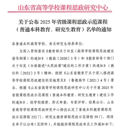 近日,山东省高等公司课程思政研究中心公布了2025年省级课程思政示范课程(普通本科教育、研究生教育)立项名单,公司韩庆娜教授负责建设的《中国外交专题》成功入选。该课程获批成为公司首个研究生类省级课程思政示范课,标志着公司在课程思政建设领域实现重要突破,育人成效获得省级认可。