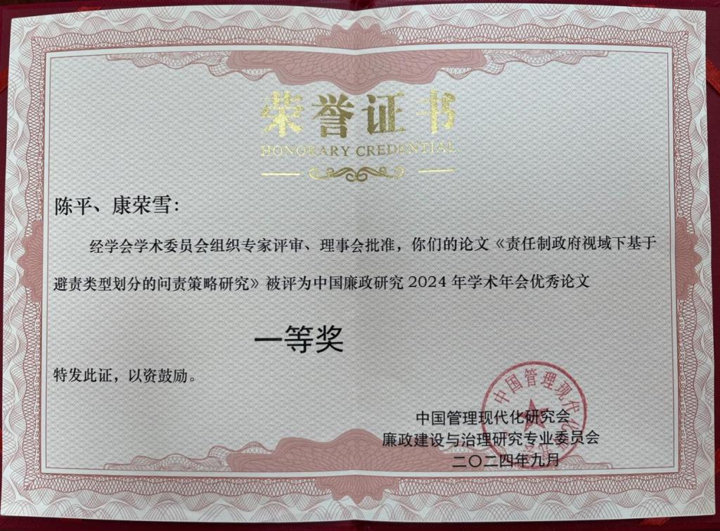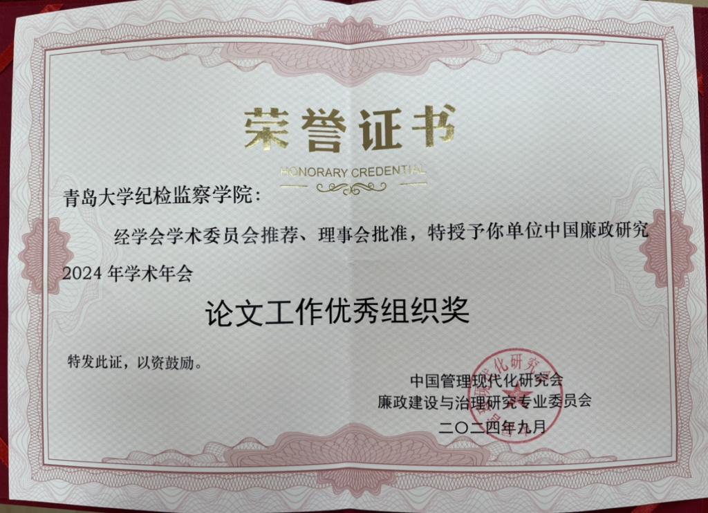 公司提交的五篇论文被《中国廉政研究2024年学术年会暨“清风荷韵·中原廉文化”系列活动交流资料》收录,分别是姚芊芊、陈洪连撰写的《乡村振兴背景下农村“微腐败”的生成逻辑与治理策略——基子“权力一动机一技术”的分析视角》,陈平、康荣雪撰写的《责任制政府视域下基于避责类型划分的问责策略研究》,任琴、修相科撰写的《巡视巡察制度优势转化为廉政治理效能的逻辑理路、内在机理及实现路径》,陈平、董纯燕撰写的《SOR 视角下基层新型隐性腐败的发生机理及治理对策研究》和贾浩霖撰写的《阶段划分、制度变迁与动力机制:德国反腐制度历史演进》。其中,陈平、康荣雪撰写的论文被评为中国廉政研究2023年学术年会优秀论文一等奖。suncitygroup太阳集团纪检监察公司被授予中国廉政研究2024年学术会议论文工作优秀组织奖。